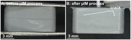 (A) Photograph of an assembled mold (made of upper and lower halves) before µIM process. Both parts of the mold fit well together. The edges of both halves are flush with each other. (B) A mold after µIM process. The upper half is cracked.