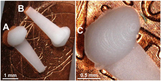 Figure 9A shows the top view and Figure 9B shows the bottom view of two GP-RNI. The implants are homogeneously colored and show no failures such as burns, black spots, short shots or deformations. There are a few flash failures around the contour of the implant, where the mold halves met (Figure 9C). Moreover, the implant’s surface shows stair casing (Figure 9C) because the built resolution of the implant is limited to the DLP 3D-printing resolution of z = 10 µm per layer, which was used for mold manufacturing. Nevertheless, a layer height of z = 10 µm is a relatively low value compared to other methods, especially non-photopolymerzing 3D-printing methods [34]. Consequently, the utilized DLP technique allows µIM of implants with a relatively high resolution. An alternative photopolymerizing 3D-printing technique that enables a higher resolution and a lower staircase effect could be two-photon polymerization (2PP) [21]. However, in comparison to DLP, the use of 2PP would most likely lead to significantly higher 3D printing times. With our current state of knowledge, it is not clear which resolution is needed for therapeutically effective RNIs. In [45], we reported good fitting accuracy of prototypes of human RNIs with a z = 100 µm per layer, which were implanted in human cadaver RWN. We further found that a higher resolution, respectively a lower z-value per layer, leads to increased contour accuracy. The highest possible contour accuracy might be desirable. Increased contour accuracy most likely may lead to a better interface between the implant and the RWM. Consequently, a more effective drug transport into the inner ear by drug diffusion through the RWN might be achieved. Further investigations are needed at this point. At this point, the xy resolution of 32 µm and the z resolution of z = 10 µm (layer height) used here enable 3D printing of a relatively high resolution and a high contour accuracy.