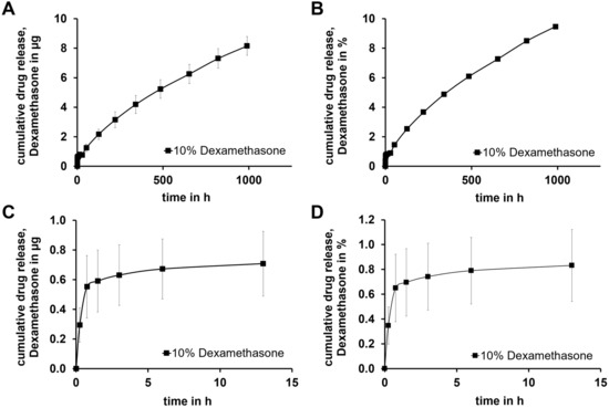 Diagrams show (A) cumulative drug release of DEX absolute amount of DEX for about 6 weeks, (B) relative DEX release for about 6 weeks, (C) enlarged representation of the complete release over the first 15 h, (D) enlarged representation of the relative release over the first 15 h; Diagrams (B,D) were normalized according to the calculated amount of DEX 10 % of the RNI-mass. Drug release testing continues.