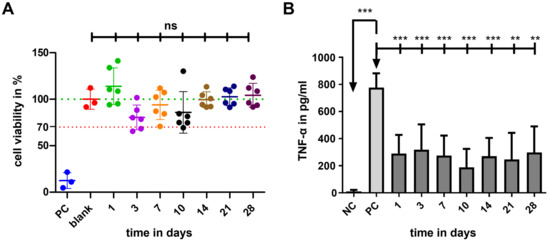 The results of in vitro biocompatibility (cell viability) and bioefficacy (TNF-α-reduction test) investigations are shown in Figure 11. Compared to the blank (100%), the cell viability of the PC, including the cytotoxic agent DMSO, was significantly reduced (12 ± 9%; p < 0.001), proving the successful experimental setup. The cell viability of all GP-RNI-supernatant samples (mean ± SD; day 1: 114 ± 19%; day 3: 80 ± 13%; day 7: 94 ± 16%; day 10: 85 ± 22%; day 14: 99 ± 9%; day 21: 102 ± 9%; day 28: 104 ± 13%) did not differ significantly from that of the blank (Figure 11A). The lowest cell viability was 80.44 ± 13.30%. It was found when the supernatant of sampling day 3 was applied. It is still clearly above the 70% of the blank, which is the mark for indicating cytotoxic potential.