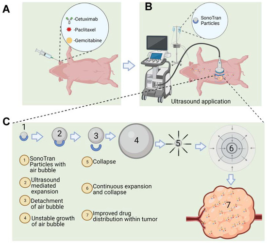 Schematic illustration of ultrasound-mediated cavitation using SonoTran Particles. (A) Cetuximab, paclitaxel, and gemcitabine are injected individually. (B) Infusion of gas-stabilized SonoTran Particles with concurrent ultrasound application targeting pancreatic tumor(s). (C) Schematics of air bubble expansion and collapse carried by the SonoTran Particles and FUS creating cavitation and improving drug distribution within the tumor.