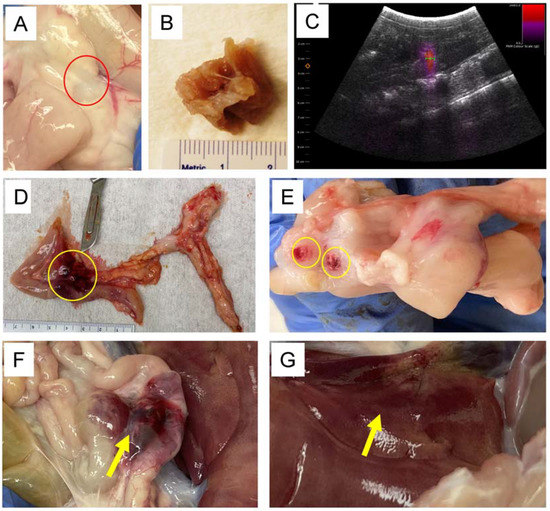 Panc-1 human pancreatic cancer cells were successfully engrafted in the pig pancreas and were effectively targeted using focused ultrasound. (A) Representative gross image of a human Panc-1 tumor in situ. (B) Excised human Panc-1 tumor. (C) US image of ongoing SonoTran therapy. Red color indicates active therapy targeting pancreatic tumor. (D) Gross image of human Panc-1 tumor grown in immunocompromised pig pancreas and hemorrhage from ultrasound-induced cavitation (indicated by yellow circle). (E) Gross image of Panc-1 tumor and hemorrhage following ultrasound-induced cavitation (indicated by yellow circles). (F) Off-target hemorrhage in the intestine (Yellow arrow). (G) Off-target hemorrhage in the liver (Yellow arrow).