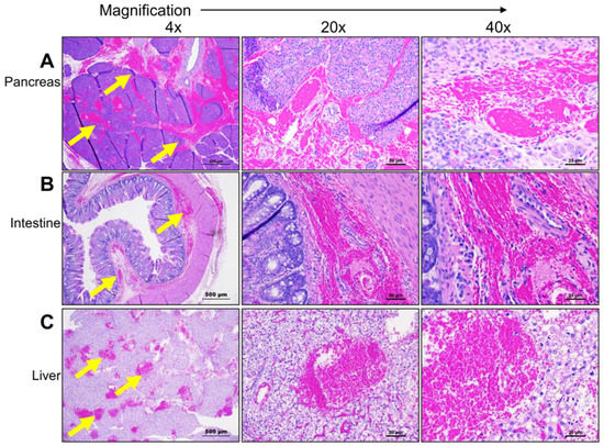 Histopathology assessments reveal ultrasound-mediated cavitation hemorrhaging in healthy organs within the treatment zone. Representative images of H&E-stained tissue sections were generated during histopathological evaluation of treatment effectiveness. (A) Treated immunocompromised pig pancreas showing minor to moderate hemorrhaging (yellow arrow) within the US treatment window of the healthy pancreas. (B,C) Additional off-target hemorrhaging was observed in the (B) intestine and (C) liver of treated animals. (A–C) Left to right- 4×, 20× and 40×, respectively. Scale bars are 500 µm for 4×, 50 µm for 20×, and 25 µm for 40× magnification.