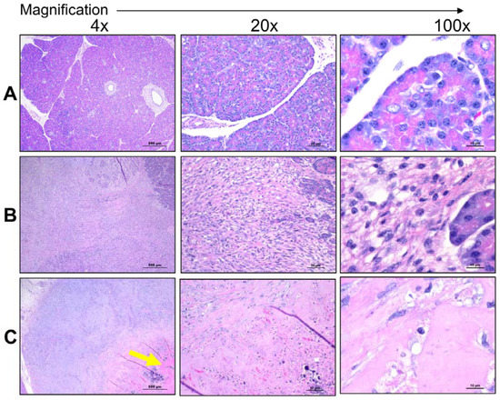 Effective targeting of human Panc-1 orthotopic porcine tumors in situ using ultrasound-mediated cavitation. Representative images of H&E-stained tissue sections were generated during the histopathological evaluation of treatment effectiveness in pigs with engrafted tumors. (A) Immunocompromised pig pancreas without ultrasound treatment. (B) Human Panc-1 tumors were effectively generated in the RAG2/IL2RG-deficient pigs and demonstrate histopathological features consistent with orthotopic cell line-based tumor models and human patient tumors. (C) Ultrasound-mediated cavitation resulted in clear margins defining the treatment zone with altered tumor structural features and areas of increased hemorrhage (yellow arrow). (A–C) Left to right- 4×, 20× and 100×, respectively. Scale bars are 500 µm for 4×, 50 µm for 20×, and 10 µm for 100× magnification.