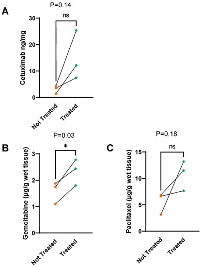 Ultrasound-mediated cavitation using cavitation nuclei increases the tumor delivery of cetuximab, gemcitabine, and paclitaxel. ELISA and mass spectrometry (UPLC-MS/MS) was used to quantify Cetuximab, gemcitabine, and paclitaxel, respectively. (A) ELISA quantification of Cetuximab comparing ultrasound targeted (treated) and untargeted (untreated) tumor tissue shows significant accumulation in the treated tumor. (B,C) MS analysis of gemcitabine and paclitaxel comparing treated and untreated tumor tissue reveals increased delivery of both drugs in the ultrasound-treated tumor compared to the untreated tumor. ns denotes not significant; * denotes p < 0.05.
