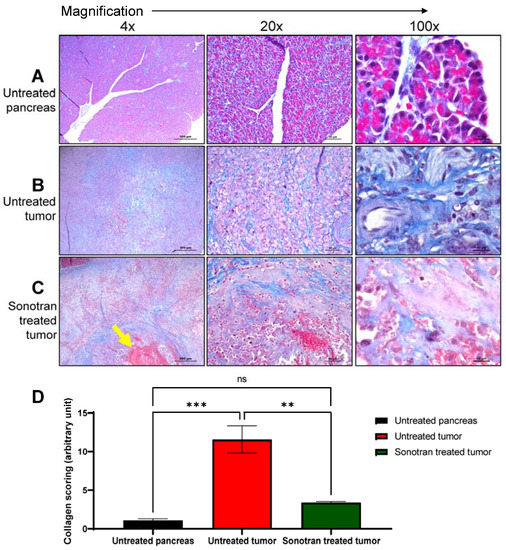 Trichrome stain reveals differences in collagen deposition and stroma among control, tumor and SonoTran-ultrasound-treated tumors. Representative tumor sections were stained with Trichrome for analysis of collagen deposition and tumor stroma assessments. (A) Immunocompromised pig pancreas without ultrasound treatment. (B) Orthotopic Panc-1 tumor in pig pancreas, without ultrasound treatment. (C) Panc-1 tumor treated with ultrasound-mediated cavitation using SonoTran Particles. (D) Quantification of trichrome images using FIJI image analysis reveals a reduction in collagen (blue staining in the images) after therapy. (A–C) Left to right- 4×, 20× and 100×, respectively. Scale bars are 500 µm for 4×, 50 µm for 20×, and 10 µm for 100× magnification. Areas of increased hemorrhage are noted with the yellow arrow. ns denotes not significant, ** denotes p < 0.01, *** denotes p < 0.001.