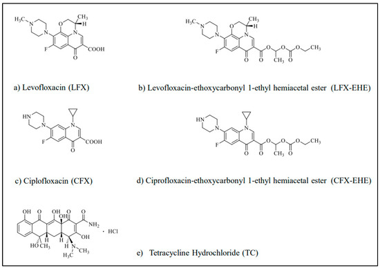 Chemical structures of (a) levofloxacin (CFX), (b) levofloxacin-ethoxycarbonyl 1-ethyl hemiacetal ester (LFX-EHE), (c) ciprofloxacin (CFX), (d) ciprofloxacin-methoxycarbonyl 1-ethyl hemiacetal ester (CFX-EHE), and (e) tetracycline hydrochloride used in the present study.