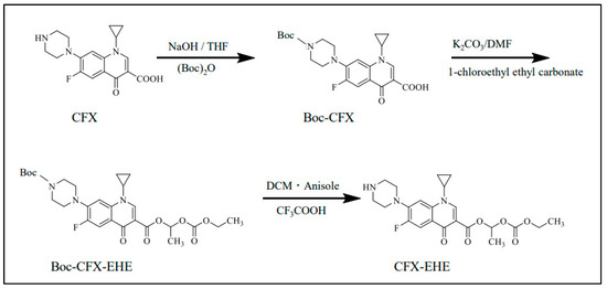 Stepwise scheme of the synthesis process of CFX-EHE from CFX via Boc-CFX and Boc-CFX-EHE.