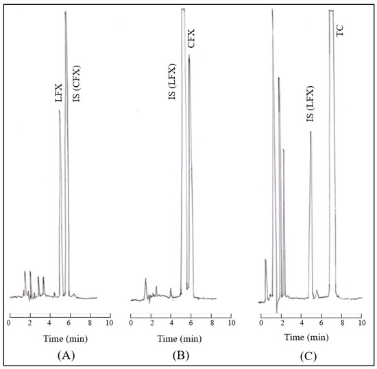 Chromatograms of (A) LFX (0.5 μg/mL) and CFX (IS), (B) CFX (0.5 μg/mL) and LFX (IS), and (C) TC (50 μg/mL) and LFX (IS) in control rabbits’ plasma.
