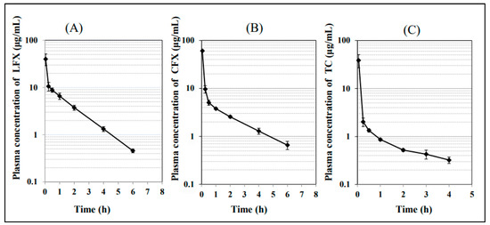 Plasma disposition of LFX (A), CFX (B), and TC (C) after a 2.8-min intravenous infusion in control rabbits. The doses of LFX, CFX, and TC for intravenous infusion were 20 mg/kg, 30 mg/kg and 10 mg/kg, respectively. Each value represents the mean ± SD (n = 3).