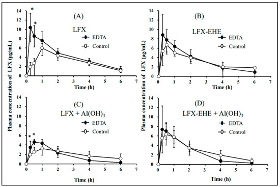 LFX and LFX-EHE were administered at a dose of 20 mg/kg as LFX, and the dose of Al(OH)3 was 100 mg/kg in both control and EDTA-treated rabbits. The time courses of LFX concentrations in plasma after oral administration of LFX and LFX-EHE in the absence and presence of Al(OH)3 are shown in Figure 6. Some pharmacokinetic parameters such as Cmax, time to reach Cmax (Tmax), AUC0–6, AUC0–∞ of plasma LFX, and oral bioavailability (F) of LFX are listed in Table 8. The oral bioavailability of LFX from LFX-EHE was comparable with the oral bioavailability of LFX itself in both control and EDTA-treated rabbits, exhibiting higher oral bioavailabilities. In the absence of Al(OH)3, both the rate of oral bioavailability (Cmax and Tmax) and the extent of oral bioavailability (AUC) of LFX in EDTA-treated rabbits were higher than in control rabbits. This indicated that both the rate and extent of oral bioavailability of LFX in control rabbits are significantly lower in control rabbits than in EDTA-treated rabbits. When Al(OH)3 was administered concomitantly with LFX, the Cmax, and AUC0–6 of LFX were significantly lower than those in the absence of Al(OH)3 in both control and EDTA-treated rabbits. In contrast, the rate and extent of oral bioavailability of LFX from LFX-EHE were comparable between control and EDTA-treated rabbits and co-administration of Al(OH)3 exerted no significant effects on the rate and extent of oral bioavailability of LFX from LFX-EH. This would indicate that LFX-EHE can prevent chelate formation in vitro and in vivo. Although there was no significant difference in the oral bioavailability between the absence and presence of Al(OH)3, however, the average Cmax and AUC of LFX from LFX-EHE in the presence of Al(OH)3 appeared to be lower as compared with the results of LFX without Al(OH)3 in EDTA-treated rabbits (Table 8).