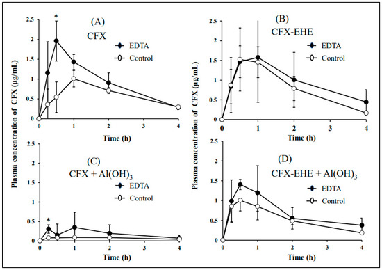 3.4. Oral Bioavailability of LFX, LFX-EHE CFX and CFX-EHE in the Absence and Presence of Al(OH)3 in Control and EDTA-Treated Rabbits