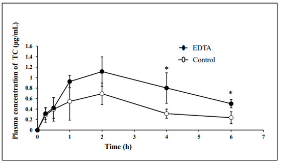 TC hydrochloride was administered orally at a dose of 150 mg/kg together with 10 mL water to control and EDTA-treated rabbits. In a separate experiment, 1 mg/mL EDTA 2Na aqueous solution was administered 1 day before administration of each drug at a volume of 40 mL (20 mL × 2, in the morning and evening) for treatment, in addition to the free access to the drinking water containing 1 mg/mL EDTA 2Na. After administration orally by stomach intubation, blood samples (100 μL each) were taken periodically from the ear vein at 0.25, 0.5, 1, 2, 4 and 6 h. Blood samples were centrifuged at 3000× g for 10 min to obtain plasma samples.
