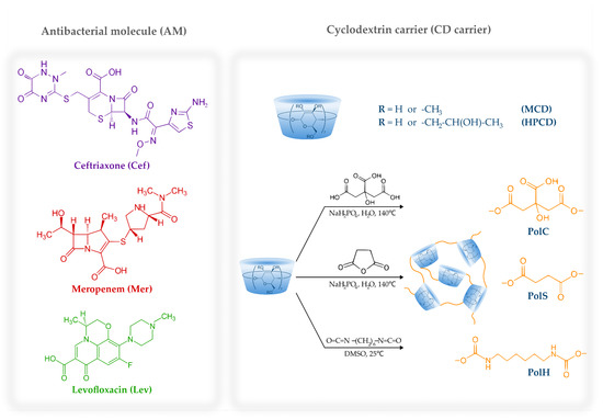 The chemical structures of ceftriaxone, meropenem, levofloxacin, HPCD, MCD and the schematic representation of CD-based polymers.