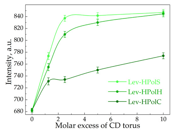 For the determination of Ka values, we used fluorescence spectroscopy. At λex = 345 nm, Lev demonstrated a peak with a maximum at 458 nm corresponding to the π* → π transitions. In the presence of all the CD polymers, the intensity of the peak rose with the increase in the carrier’s molar excess (Figure 2), which is typical for drug–CD complexes [33]. Interestingly, we did not observe the pronounced saturation for Lev complexes with HpolC and HpolS, whereas in the case of Lev–HpolH the plateau appeared at a CD torus molar excess of 0.5. Thus, probably only some of the HpolH binding sites were available for interaction. Apparently, the positive ζ-potential of the particle repelled Lev’s positive charge in the heterocycle. In the case of HpolC and HpolS, no saturation indicated that not only were the CD tori involved in binding, but also that there were some additional binding centers, possibly unreacted –COOH groups of the polymer.