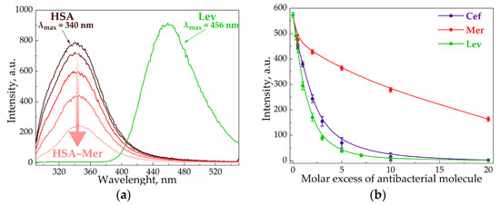 The Ksv and Ka values for AM–HSA were in good agreement with the literature data [23,41,42]. It is worth noting the significance of albumin’s quenching lowering for Lev > Cef >> Mer. The most hydrophobic Lev molecule apparently bound to HSA most effectively via hydrophobic interactions with Trp, which contributed greatly to HSA fluorescence. Indeed, for Lev–HSA, the position of the albumin’s emission maximum shifted to the long-wavelength region by about 10 nm. This may additionally indicate that the Trp residue appears in a less hydrophobic environment [43]. Similar changes were not observed in the case of Mer and Cef, which indicated less effective complexation with HSA.