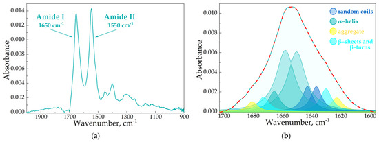 In the FTIR spectra of HSA, we observed two specific bands corresponding to the oscillations of peptide bonds. The amide I (1600–1700 cm–1) band represents the oscillation of ν(C=O)~80% and ν(C-N)~15%, while the amide II (1500–1600 cm–1) bands correspond to δ(N-H)~60%, ν(C-N)~20% and (C-C)~10% [56,57,58]. Both bands were sensitive to the changes in the protein secondary structure, and the amide I analysis provided important insights into the changes in the protein’s secondary structure. The deconvolution of this band uncovered the contents of α-helices, β-structures (β-turns and β-sheets) and random coils (Figure 4).