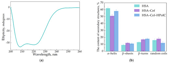 Circular dichroism spectrum of HSA, C = 0.05 mM, pH 7.4 (a). The content of secondary structures in HSA, CHSA = CCef = CCDtori = 0.02 mM, pH 7.4 (b).