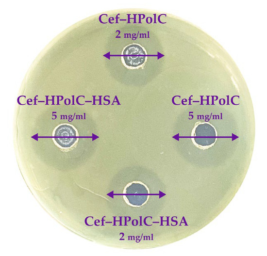 We determined the minimum inhibition concentration (MIC) by the agar well diffusion method [25,26,27]. The cell’s suspension (overnight Escherichia coli ATCC 25,922 (grown in Luria Bertuni medium for 12 h)) was diluted to 0.5 McFarland standard. Four wells with diameters of 9 mm were cut in the agar by sterile plastic pipette tips after the distribution of bacteria over the agar surface. A total of 50 μL of the samples (sterile buffer (negative control), AM, AM–HPCD, AM–HSA, AM–HpolH (HpolC for Cef), and AM–HpolH–HSA (HpolC for Cef); CLev = 0.1, 0.2, 0.5 μg/mL and CCef/Mer = 1.0, 2.0, 5.0 μg/mL for each sample) were placed in wells. Then, the Petri dishes with samples were incubated at 37 °C. After 24 h, the diameters of the inhibition zones were analyzed. MICs were defined as the concentration of the sample at which the absence of the bacterial growth equals that of the removed agar (diameter ≈ ca. 9 mm) (7):