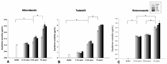 Equilibrium solubility of albendazole (A), tadalafil (B) and ketoconazole (C) in absence and presence of solutions of 0.1, 0.5 and 1% (w/v) PVP K15, K30, K60 and K120 (n = 3) (mean ± SD). Asterisk (*) indicating statistically significant differences (p < 0.05).