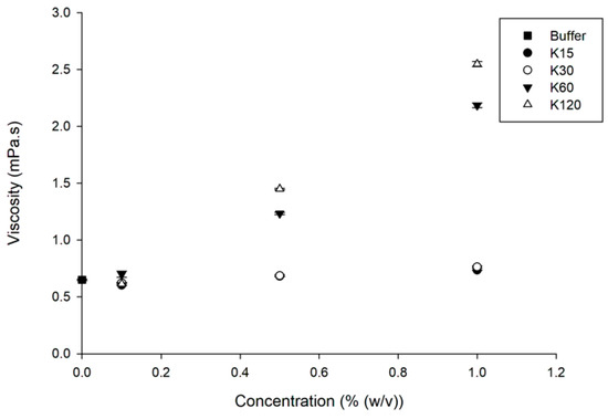 ANOVA showed no statistically significant difference (p > 0.05) in solution viscosity for water, PVP K15 and K30 in the concentration range of 0.1 to 1% (w/v) PVP. In contrast, the solution viscosities for PVP K60 and K120 were statistically significantly different (p < 0.05) and increased with increasing concentration. As expected, PVP K120 had the highest solution viscosity for all concentrations of PVP, compared to PVP K15, K30 and K60.