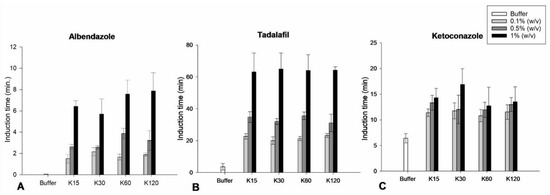 In solutions of PVP K15, K30, K60 and K120, ANOVA showed a statistically significant increase (p < 0.05) of tind of albendazole and tadalafil when increasing the PVP concentration from 0.1 to 0.5% (w/v) and again from 0.5 to 1% (w/v), respectively (Figure 4A,B).