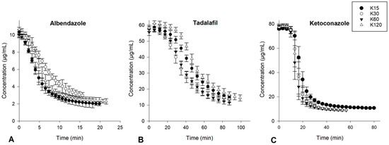 For albendazole, tadalafil and ketoconazole, ANOVA showed a statistically significant difference (p < 0.05) in the slope of the time–concentration profiles of the drugs in the presence of isoviscous solutions of PVP K15, K30, K60 and K120 when increasing the PVP molecular weight (Figure 8).