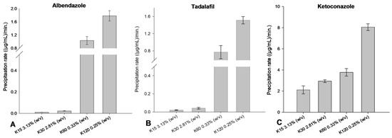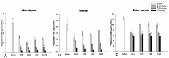 For albendazole, tadalafil and ketoconazole, the slope of the time–concentration profile generally decreased with increasing concentrations of PVP K15, K30, K60 and K120 in solutions compared to the slope of the time–concentration profiles in the absence of PVP (Figure 6). For albendazole and tadalafil (Figure 6A,B), ANOVA showed a statistically significant difference (p < 0.05) in the slope of the time–concentration profile of the drugs in the presence of solutions of PVP K15, K30, K60 and K120 when increasing the PVP concentration from 0.1 to 0.5% (w/v) and again from 0.5 to 1% (w/v). This can be explained by the solubility of the drug increasing with increasing concentrations of PVP and thereby effectively decreasing the degree of supersaturation, leading to a slower precipitation rate [3,4,6]. This result is in line with a previous study that investigated the precipitation rate of indomethacin from a supersaturated solution at degrees of supersaturation of <1.6, 2 and 6 and found that increasing the degree of supersaturation resulted in an increased precipitation rate [14]. Furthermore, another study conducting a similar investigation showed that at a high degree of supersaturation of indomethacin in the absence of PVP, the precipitation rate was mainly diffusion controlled; however, in the presence of PVP, the precipitation rate was slowed down as the mechanism shifted to surface integration being controlled by the polymer providing an interfacial barrier for crystal growth by hydrogen bonding to indomethacin [23].