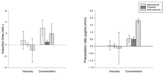 For albendazole, tadalafil and ketoconazole, the coefficient plot shows that the PVP concentration has a significant influence on the tind and slope of the time–concentration profile, while the viscosity of the PVP solution has no significant influence on either tind or slope of time–concentration profile (Figure 7).