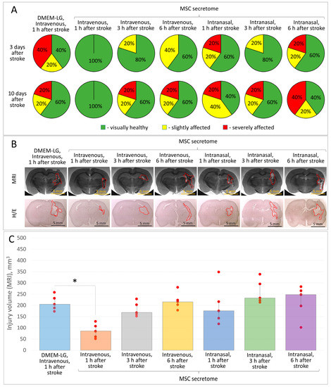 The results of in vivo studies of the neuroprotective activity of MSC secretome (10-fold concentrated) depending on the door-to-treatment time (1, 3, and 6 h after the hemorrhage modeling) using intravenous and intranasal routes of administration in the model of intracerebral hemorrhage in rats: (A) the severity of neurological deficits in experimental animals 3 and 10 days after hemorrhage modeling; (B) samples of the brain lesion foci 14 days after hemorrhage modeling (MRI, histochemical staining), H/E—Hematoxylin/Eosin; (C) quantitative assessment of the brain lesion volume according to MRI. Data are presented as a median (25%; 75%). * p ≤ 0.001, n = 5, Student’s t-test, t = −5.944 with 8 degrees of freedom.