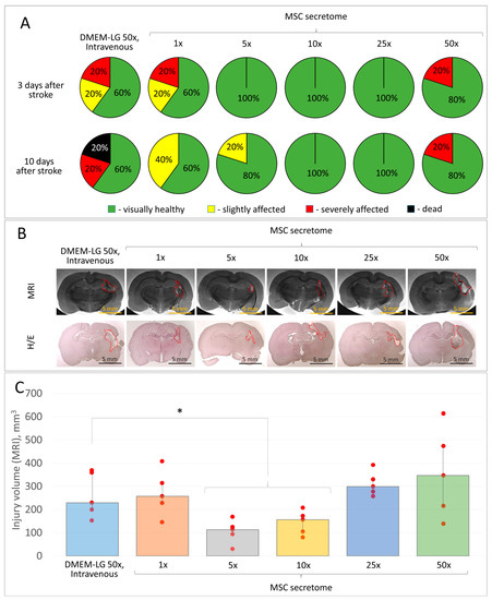 The results of in vitro studies of MSC secretome depending on the concentration used (non-concentrated 1×, 5-, 10-, 25-, and 50-fold concentrated) being intravenously administered 1 h after modeling the intracerebral hemorrhage in rats: (A) the severity of neurological deficits in experimental animals 3 and 10 days after hemorrhage modeling; (B) samples of the brain lesion foci 14 days after hemorrhage modeling (MRI, histochemical staining), H/E—Hematoxylin/Eosin; (C) quantitative assessment of the brain lesion volume according to MRI. Data are presented as a median (25%; 75%). * p < 0.05, n = 5, Student’s t-test.