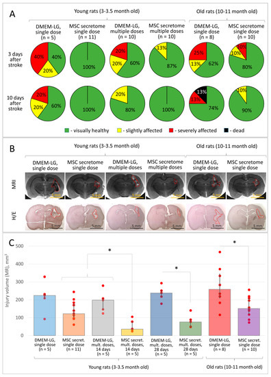 Various forms of cerebrovascular diseases (including stroke) mostly occur in people in adulthood and are often associated with obesity, metabolic, or cardiovascular disorders. Since the effectiveness of neuroprotection and neuroregeneration processes may differ for a number of reasons in a young and mature organism, we decided to elucidate if MSC secretome would reveal its neuroprotective activity in the model of intracerebral hemorrhage in aged rats. The results of the study confirmed that a single intravenous administration of 100 µL of MSC secretome (10×) stimulated the survival and support of neurological functions of experimental animals and reduced the volume of the brain lesion in rats aged 10–11 months (Figure 4A,C). Thus, the brain lesion volume in old rats that received a single intravenous injection of MSC secretome (10×) was 156 (88; 196) mm3 vs. 219 (183; 334) mm3 in the Control group (p < 0.05; n ≥ 8) (Figure 4B,C). There were no significant differences in the neuroprotective efficiency of MSC secretome between young (3–3.5 months) and aged (10–11 months) rats. The results of the histological study coincided with the data from the MRI examination (Figure 4B).