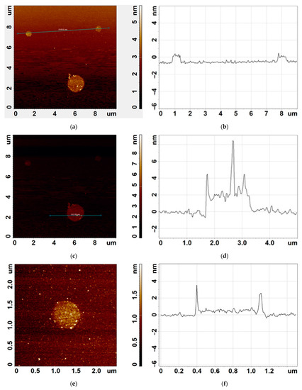 The formation of micelles from grafted chitosans was confirmed by AFM (atomic force microscopy), NTA (nanoparticle tracking analysis), and DLS (dynamic light scattering) methods. Using AFM, the morphology of micelles loaded with pyrazole 1 was studied in comparison with non-loaded micelles (Figure 2). The micelles loaded with the drug have a disc-like shape, 1–2 nm thick (vs. 20 nm for non-loaded micelles), and the diameter of the “disc” varied from 200 nm to 1.65 μm. The median diameter was 550 nm (SD = 150 nm). These values are strikingly different from those obtained for micelles without a drug (30 nm) and unmodified chitosan forming aggregates. In the case of micelles containing the drug, smooth dense “discs” are formed due to the compaction of the micelle structure around the drug molecules. In other words, we observe significant changes in the texture of micellar objects when the drug is turned on, which proves the effective inclusion of the drug and the formation of soluble particles. The literature also describes the use of AFM to determine the shape and morphology of lipid particles such as liposomes or micelles; when the drug is turned on, the micelles regroup and form a denser structure, since the drug initiates and compacts the micelles [28,62,63,64,65].