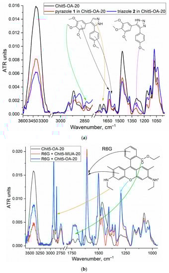 FTIR spectroscopy allows us to study the molecular details of the interaction of drugs with micelles, to find out which functional groups are involved. Figure 5 and Figure S6 show the FTIR spectra of micelles from amphiphilic polymers non-loaded and loaded with drugs 1–5. After loading cytostatics into micelles, characteristic bands increase in intensity in the FTIR spectra, corresponding to the oscillations of C=C, N=N, C=N in aromatic systems (1520–1650 cm−1), C–O–C of CH3–O–aryl (1270–1340 cm−1), and CH3–O (2835 cm−1). In the FTIR spectrum of rhodamine 6G, when included in the micelles, there is an increase in peak intensity by 1700–1750 cm−1, corresponding to C=O of the ester (Figure 5b). The formation of micelles is confirmed by a decrease in the intensity of the N–H peak of Chit5 (3300–3500 cm−1), which indicates the structuring of chitosan polar chains from aggregates into ordered assembles. The compactification of micelles and core formation when the drug is incorporated in the micellar structure is confirmed by the shift of the peaks of the CH2 groups of acyl tails of micelles (3000–2800 cm−1) into the low-frequency region.