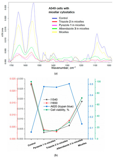 FTIR spectroscopy is a powerful method for determining the effect of a drug on cells (the state of functional groups and in the main components of cells), since we have recently developed an effective approach that makes it possible to monitor the effectiveness of both cytostatics on tumor cells and antibacterials on bacteria, and we can observe selectivity against tumor cells and a protective effect on normal cells [56]. FTIR spectroscopy is a sensitive method that allows the monitoring of changes in the main components of cells (lipid membrane 2850–3000 cm−1, proteins 1500–1720 cm−1, DNA 1240 cm−1, carbohydrates 1000–1100 cm−1) when interacting with the drug. Figure 7a shows the FTIR spectra of A549 cancer cells after 12 h of incubation with cytostatics and micelles. A decrease in the intensity of peaks relative to the control indicates a decrease in the number of viable cells and a change in the state of the living (become dying). The intensity of the peaks of amide I (1600–1700 cm−1) and amide II (1500–1600 cm−1) correlates with the number of viable cells (Figure 7b), which is shown with the use of the dye trypan blue (coloring mainly dead cells).