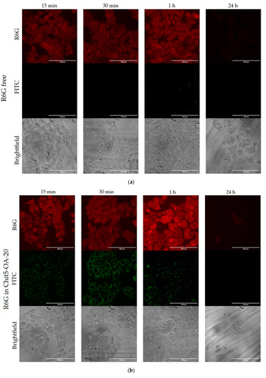 Fluorescence and optical images of A549 after 15–30 min, 1 h or 24 h incubation with rhodamine 1 μg/mL: (a) R6G free, (b) R6G in Chit5-OA-20, (c) R6G in Chit5-MUA-20 S–S stitched, (d) R6G in FITC-labelled Chit5-MUA-20. R6G red, brightfield and green FITC-labelled micelles channels are shown. R6G/micelle 1:1 w/w. The scale segment is 100 µm.