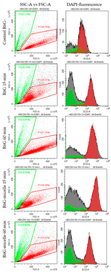 A CytoFLEX S flow cytometer (Beckman Coulter, California, CA, USA) was used to study micelles, as well as A549 and HEK293T cells with fluorophores (R6G). Detection of fluorescent micelles (400 nm in size) by a cytometer showed the perspective option for micelles studied with this new analytical technique. The cells were incubated with pure rhodamine 6G and rhodamine 6G in micelles (to achieve a final concentration of 5 µg/mL for each dye) for 15 or 60 min, then washed with PBS buffer and centrifuged at 2000× g for 5 min, followed by resuspension in PBS buffer at a concentration of 1 × 106 cells/mL. The CytoFLEX S flow cytometer was set up according to the manufacturer’s instructions. The sample tube was loaded onto the flow cytometer and data were collected using the 488 nm laser for excitation. The fluorescence emissions were collected using a 585/42 nm bandpass filter. Data were collected for 10,000 cells or micelles for each sample. The collected data was then analyzed using CytExpert software. Gating was applied to exclude debris and doublets, and only single cells/micelles were analyzed. Mean fluorescence intensity (MFI) was measured for the cells/micelles stained with pure rhodamine and rhodamine in micelles. The gating was performed based on the values of front and side light scattering (high side (SSC) is typical for debris, and high front (FSC) is for cells or micelles) and the fluorescent channel (relative to cell/background autofluorescence).