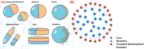 The general structure of (A) Janus, Adapted with permission from Honciuc Ref. [62]. Copyright 2019 Springer and (B) dendrimer particles, Adapted with permission from Araujo et al. Ref. [63]. Copyright 2018 MDPI.