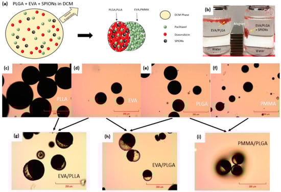 A simple and single-step solvent emulsion technique used to fabricate polymeric Janus particles for theranostic applications. (a) Theranostic polymeric Janus particles made of both biodegradable and non-biodegradable polymers, (b) magnetic response of drug and SPIONs-encapsulated EVA/PLGA Janus particles, (c–f) a comparison of SPION encapsulation in different polymers i.e., PLLA, EVA, PLGA, and PMMA, (g–i) the formation of SPIONs-encapsulated Janus particles: EVA/PLLA, EVA/PLGA, and PMMA/PLGA. Reproduced with permission from Lim et al. Ref. [75]. Copyright 2019 Wiley.