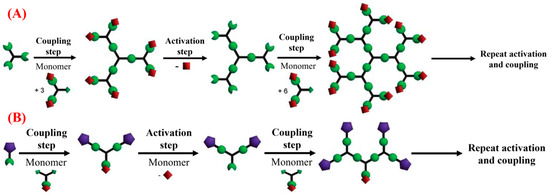 Schematic representation of (A) Divergent and (B) convergent approach, Concept adapted from Grayson et al. Ref. [85]. Copyright 2001 American Chemical Society.