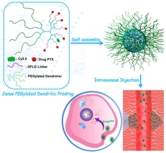 Schematic representation of PEGylated Janus-dendrimer and their self-assembly for intravenous injection in murine models for enhanced stability and anticancer efficacy. Reproduced with permission from Li et al. Ref. [135]. Copyright 2017 ACS.