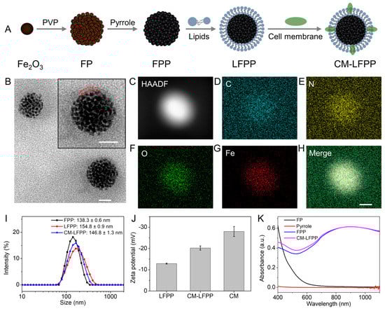 Schematic illustration and characterization of the CM-LFPP. (A) Schematic illustration for the preparation process of CM-LFPP; (B) TEM image of the CM-LFPP (Insert: enlarged TEM image of the CM-LFPP, the red line indicates the cell membrane and lipid shell); (C–H) high angle annular dark field scanning transmission electron microscopy (HAADF-STEM), EDS elemental mapping images and the merged image of the CM-LFPP; The blue, yellow, green and red areas indicate the elements of C, N, O, and Fe; (I) hydrodynamic diameters of the FPP, LFPP, and CM-LFPP; (J) Zeta potential of the LFPP, CM, and CM-LFPP; (K) The absorption of the FP, Pyrrole, FPP, and CM-LFPP. Scale bars: 50 nm.