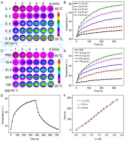 Photothermal ability of the CM-LFPP. (A) Infrared thermal images of the CM-LFPP at the concentration of 125 μg mL−1 under 1064 nm irradiation with different power densities; (B) The temperature variation curve of the CM-LFPP (125 μg mL−1) under 1064 nm irradiation at different power densities; (C) Infrared thermal images of the PBS and CM-LFPP under 1064 nm irradiation (0.6 W cm−2) with different concentrations; (D) The temperature variation curve of the PBS and CM-LFPP under 1064 nm irradiation (0.6 W cm−2) with different concentrations; (E) The temperature variation curve of CM-LFPP under 1064 nm laser irradiation for 6 min and then the laser was turned off; (F) Linear fitting of cooling time versus the negative natural logarithm of the temperature driving force acquired from the cooling period in (E).