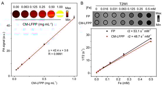 Fe2O3 nanoparticles with a size larger than 5 nm are commonly used as T2 contrast agents. Therefore, we recorded T2-weighted images (T2WI) of the CM-LFPP and ferumoxytol particles (FP). As shown in Figure 3B, the T2 images of the CM-LFPP and FP solutions darkened as the concentrations increased, indicating that they are both good T2 contrast agents for MRI. Additionally, we determined the corresponding transverse relaxivity (r2) to be 53.1 mM−1 s−1 and 48.7 mM−1 s−1 for FP and CM-LFPP, respectively, which were higher than the previous report and the commercial Resovist medium []. The similar r2 value demonstrated that the biometric modification had nearly no effect on the T2 imaging ability of the FP. These results demonstrate that CM-LFPP can be utilized as a dual-modal contrast agent for PA imaging and MRI.
