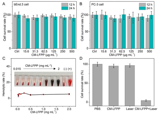 In vitro biocompatibility of the CM-LFPP. (A) Cell survival rate of bEend.3 cells and (B) PC-3 cells after being incubated with CM-LFPP; (C) Hemolytic test of CM-LFPP. “(+)” is a positive control water group and “(−)” is a negative control PBS group; (D) Cell survival rate of PC-3 cells under different treatments.