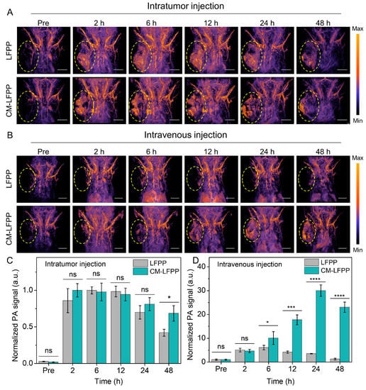 In vivo NIR-II PA imaging. The in vivo NIR-II PA imaging of the PC-3 tumor-bearing mouse at different time points before and after (A) intratumor injection of the LFPP and CM-LFPP, and (B) intravenous administration of the LFPP and CM-LFPP, respectively; (C) The quantitative analysis of the tumor region in Figure 4A; (D) The quantitative analysis of the tumor region in Figure 4B. Results are shown as the mean ± s.d., ns means no significant difference, * p < 0.05, *** p < 0.0005, **** p < 0.00005, Scale bars: 5 mm.