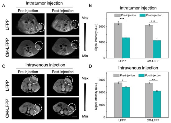 In vivo MRI. (A) The in vivo MRI of the PC-3 tumor-bearing mouse before and after intratumor injection of the LFPP and CM-LFPP; (B) The quantitative analysis of the tumor region in Figure 5A; (C) The in vivo MRI of the PC-3 tumor-bearing mouse before and after intravenous administration of the LFPP and CM-LFPP, respectively; (D) The quantitative analysis of the tumor region in Figure 5C. * p < 0.05, ** p < 0.01, *** p < 0.0005. Scale bars: 5 mm.