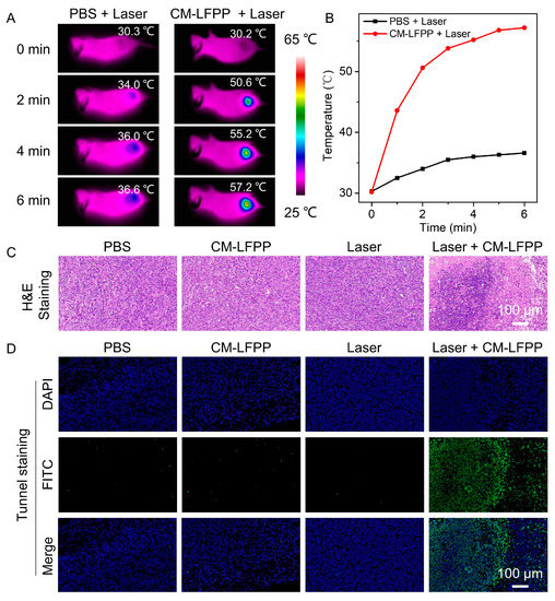 Ascribing to the high photothermal conversion efficiency of CM-LFPP, we investigated its in vivo photothermal antitumor capacity in PC-3 tumor-bearing mice. Infrared thermal images of the mice were captured after intratumor injection of PBS and CM-LFPP under 1064 nm laser irradiation. The temperature of the tumor region in the CM-LFPP-treated group increased rapidly from 30.2 to 50.6 °C after only 2 min of irradiation and continued to increase with irradiation time. After 6 min of 1064 nm laser irradiation, the temperature reached 57.2 °C, which was sufficient to destroy the tumor cells []. Furthermore, we conducted histological (H&E staining) and immunohistochemical (TUNEL) analyses to further verify the antitumor effect after PTT. No observable signs of tumor cell destruction were detected in the control groups, including PBS-treated, CM-LFPP-treated, and laser-treated mice. However, cell apoptosis was observed in the experiment group (laser + CM-LFPP) in the tumor tissue (Figure 7C), which was consistent with the TUNEL immunofluorescence results (Figure 7D), indicating that CM-LFPP is an excellent photothermal agent for tumor therapy.