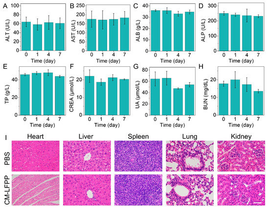 To assess the safety of CM-LFPP, we collected the main organs of BALB/c mice treated with PBS and CM-LFPP and performed an H&E analysis. Additionally, we collected blood samples from mice with various treatments (PBS-treated, 1-day, 4-day, and 7-day after intravenous injection of CM-LFPP) and conducted biochemical analysis.
