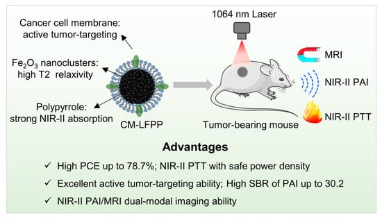 Schematic illustration and advantages of the CM-LFPP. CM-LFPP: Cell Membrane-modified Lipids-Fe2O3-PVP nanoclusters implanted in Polypyrrole; MRI: magnetic resonance imaging; PAI: photoacoustic imaging; PCE: photothermal conversion efficiency; SBR: signal-to-background ratio; PTT: photothermal therapy.